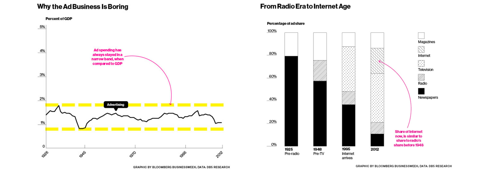In the current stream of events, the elephant in the room is that ads are not a growing business. They have always been a stable 1.3% of the U.S. GDP. And now that Google and Facebook have nearly entirely gobbled it up, they don't have room for growth. They're not incumbent businesses anymore; they are becoming obsolete.