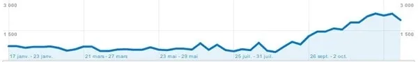 J’ai donc été agréablement surpris ce matin de voir une augmentation marquée de la fréquentation du site, qui monte gentiment vers les 3.000 visites par semaine :
