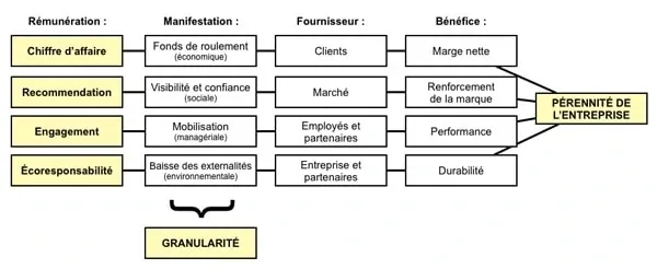 Une première forme d’innovation est la capacité pour une entreprise de toute nature, de générer équitablement les quatre formes de rémunération, afin de maximiser sa pérennité. C’est l’exemple de la clinique indienne Aravind, qui parvient à être financièrement autonome en maîtrisant ses coûts de soins à l’extrème, en mobilisant ses équipes et l’environnement social autour de son programme de traitement pour les populations pauvres et en minimisant son impact environnemental par des plans de transports collectifs pour les patients. C’est aussi un travail qui est entrepris par des groupes de dirigeants, comme ceux du CJD et leur outil de “performance globale”.