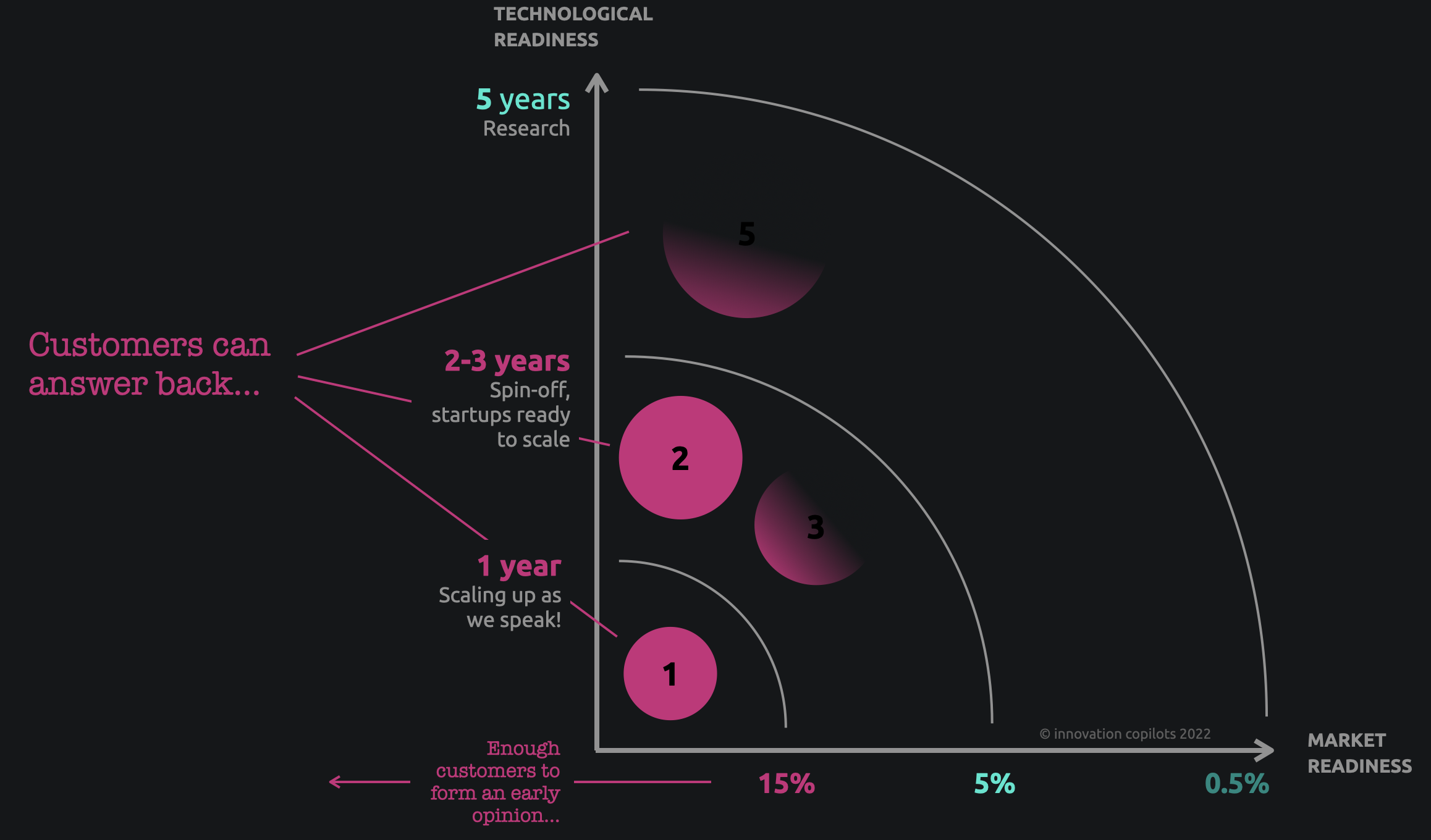 Problems that are so obvious and critical that customers do have a clear opinion about them are defined in a particular innovation space. Which one? The one where there are already enough early customers to interact with (i.e., innovators and early adopters):
