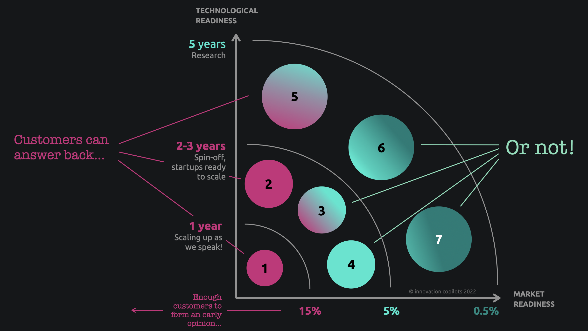 There's also a tremendously important thing about innovation: the more an innovation seems far away (, the less the market appears to have a problem to deal with), the bigger the payoff if, against all odds, you do change the market. Cue in the portfolio logic where innovation projects are strategically spread with different ratios of risk/reward...