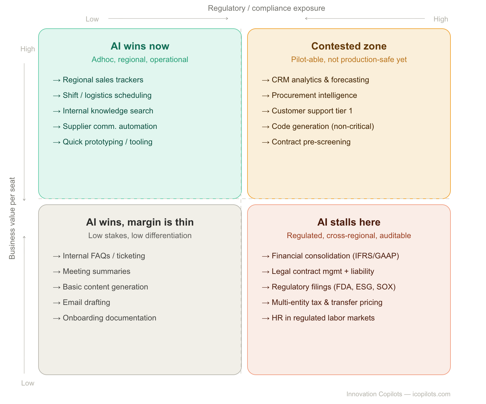 High business value per seat, combined with high regulatory exposure (the bottom-right quadrant), is where the incumbents are completely safe. It's also where the revenue that would justify a $840 billion valuation actually lives. The top-left is real and accelerating, but it's a low-margin, high-churn market by design. And the two axes together explain why the B2B adoption story being sold to investors is structurally miscalibrated.