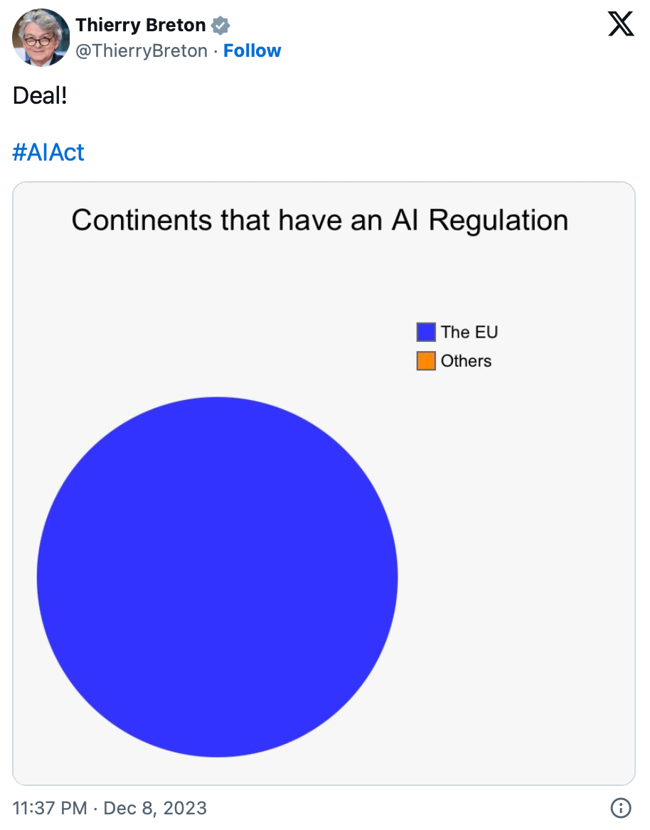 While the U.S. Congress is doing whatever, the European Union has reached a comprehensive deal on AI regulation for generative AI tools like OpenAI's ChatGPT and Google's Bard.